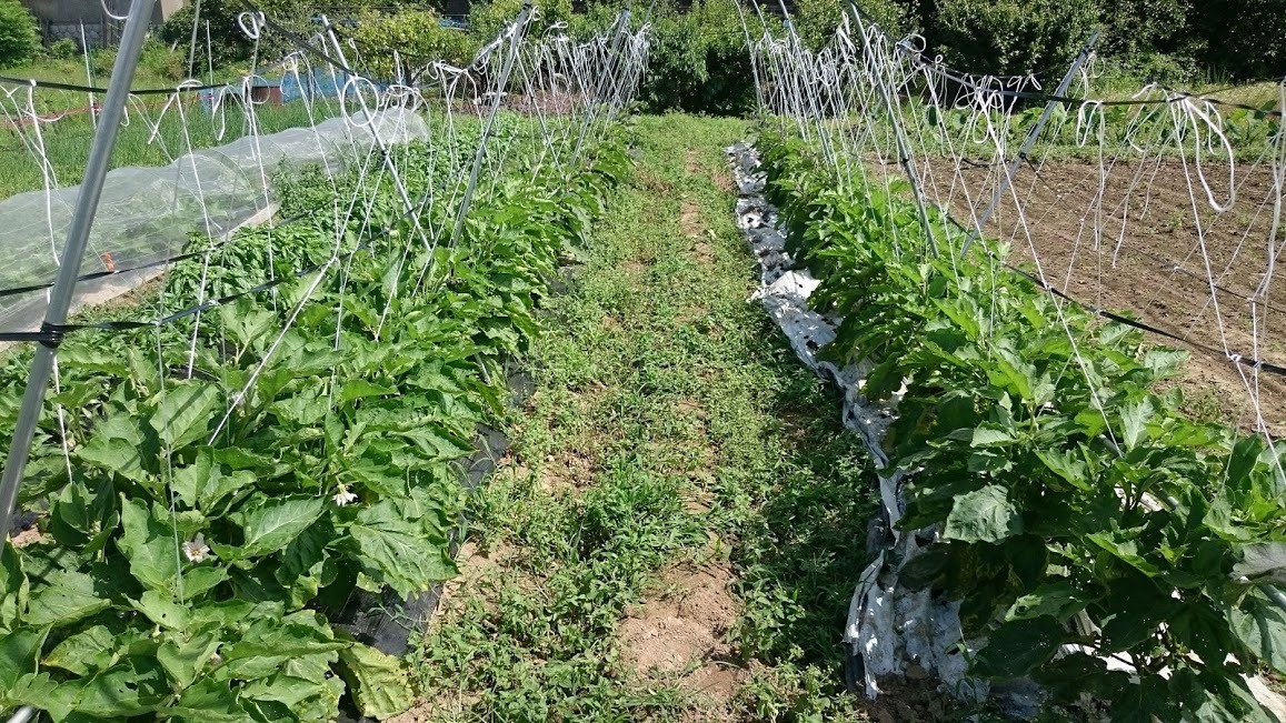 茄子1株から枝数は何本でも良いのですが、収穫の作業性と強風への耐久から考えて、3・4本にしました。