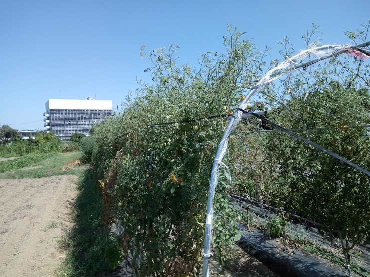 植え付けから、一定の高さまでは、脇芽を取ってまっすぐ育てますが、一定の高さを超えると、トマトに好き放題させます。