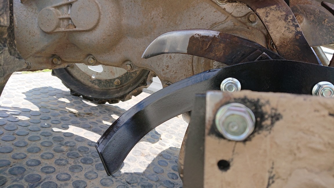2代目主力機械の耕運機、2年半で爪がナイフのように尖ってしまいましたので、ナイフのように尖ると力が逃げて深く入らなくなるようです。という事で、初めてのフル交換を行いました。